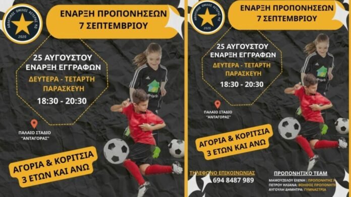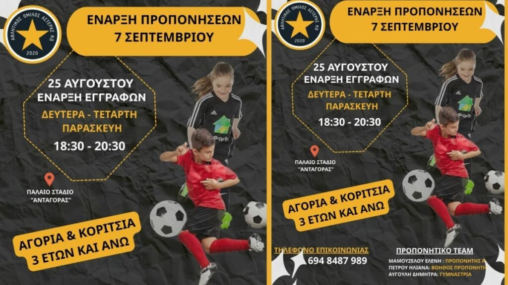 Η Ακαδημία Ποδοσφαίρου Α.Ο. ΑΣΤΕΡΑΣ ΚΩ ανακοινώνει την έναρξη των εγγραφών για τη νέα αγωνιστική περίοδο [2025 -2026].