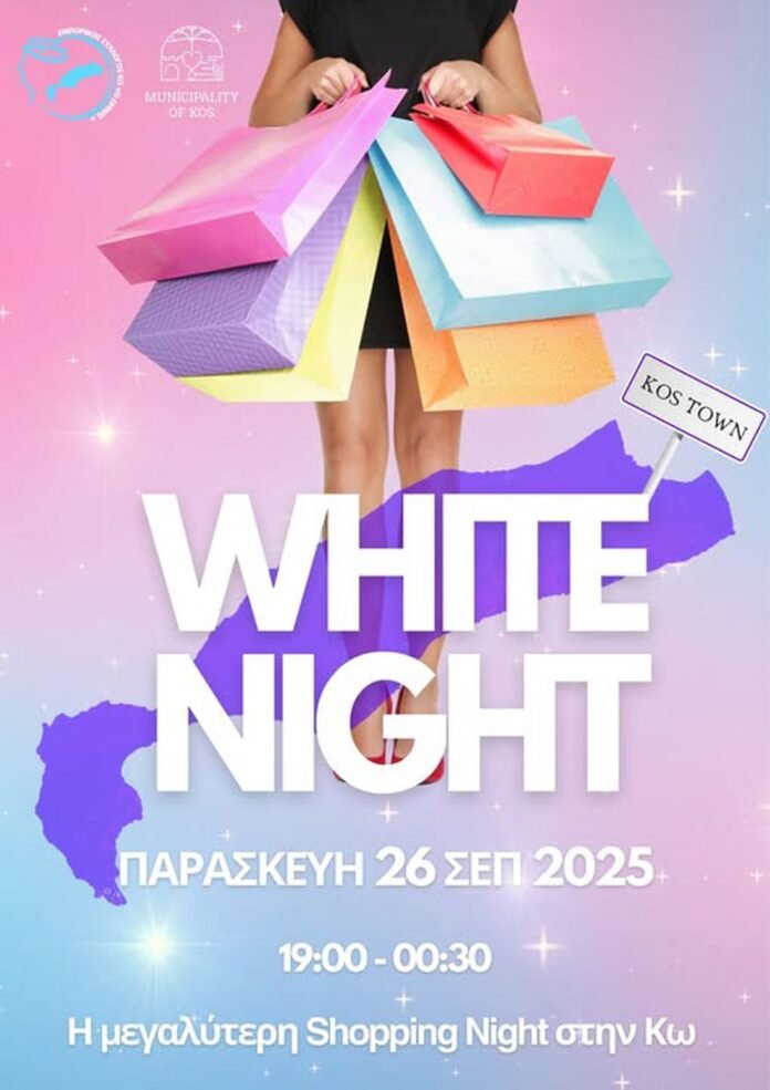 Eτοιμος να προσφέρει μία ξεχωριστή βραδιά, είναι ο εμπορικός κόσμος της Κω, που προσκαλεί επισκέπτες και κατοίκους την Παρασκευή 26/9 στον εορτασμό της “Λευκής Νύχτας”. Οι εκδηλώσεις θα ξεκινήσουν στις 7 το απόγευμα και θα διαρκέσουν έως τις 00:30 μετά τα μεσάνυχτα, δίνοντας την ευκαιρία σε κατοίκους και επισκέπτες να απολαύσουν μια μοναδική βραδιά στο κέντρο της πόλης.
