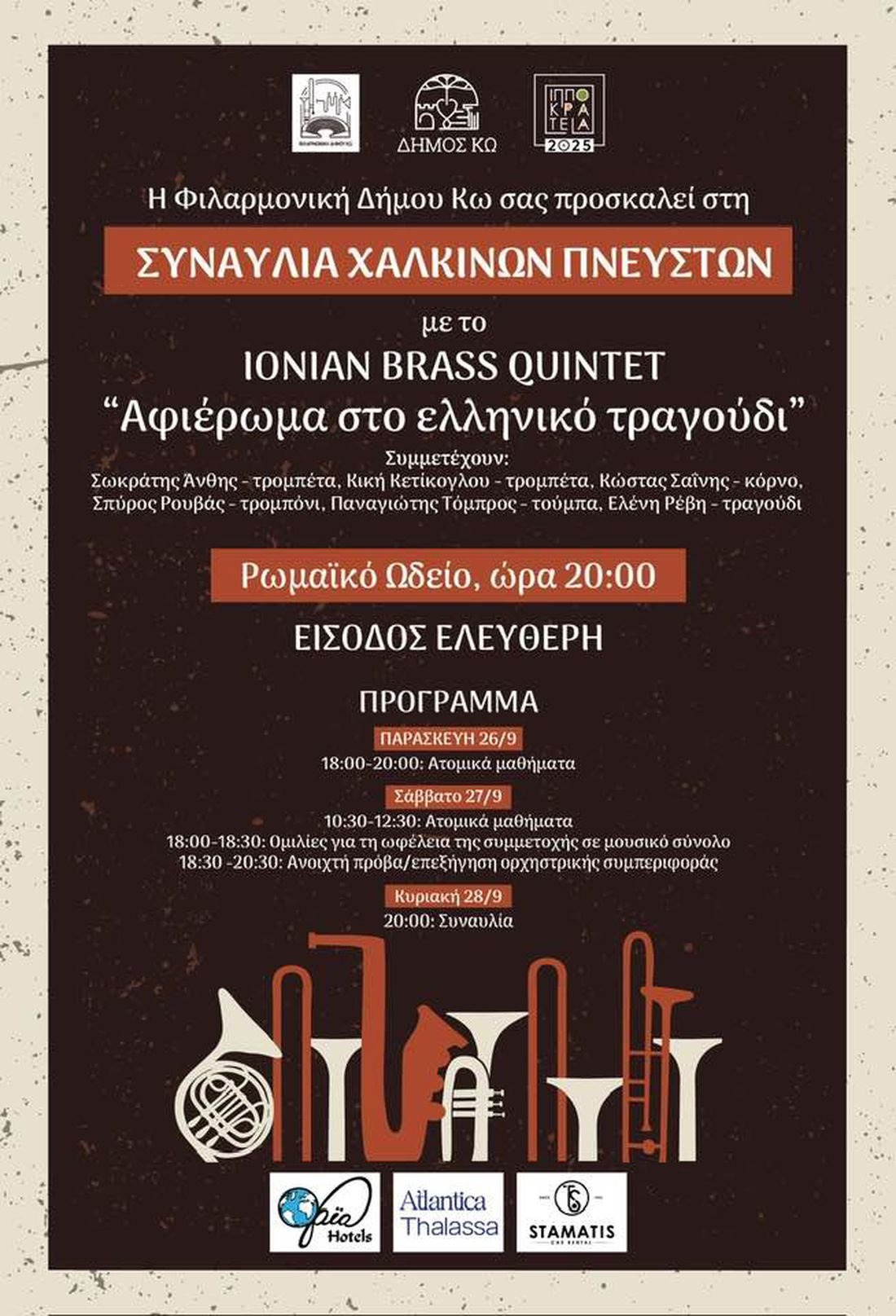 Ιπποκράτεια 2025: Τριήμερο Χάλκινων Πνευστών με το Ionian Brass Quintet και τη Φιλαρμονική Ορχήστρα Δήμου Κω