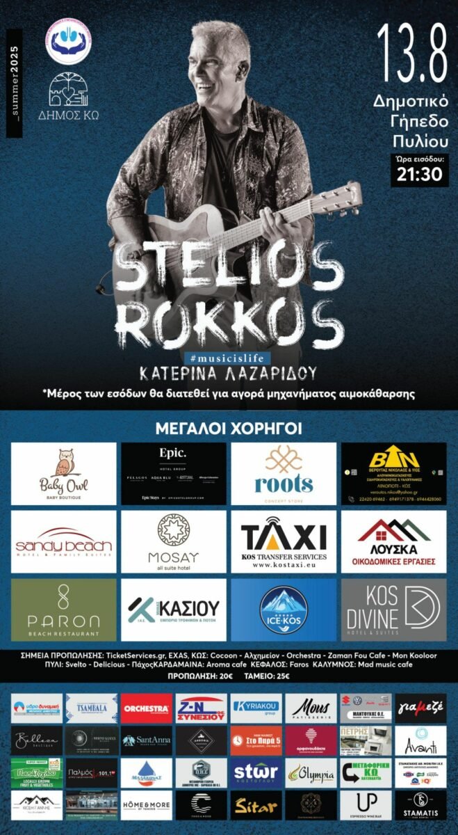 Ο Στέλιος Ρόκκος έρχεται στην Κω για μία μοναδική καλοκαιρινή συναυλία την Τετάρτη 13 Αυγούστου 2025, στο Δημοτικό Γήπεδο Πυλίου. Η είσοδος ανοίγει στις 21:30 και στη σκηνή θα βρεθεί μαζί του η Κατερίνα Λαζαρίδου, σε μια βραδιά γεμάτη μουσική και συναίσθημα.