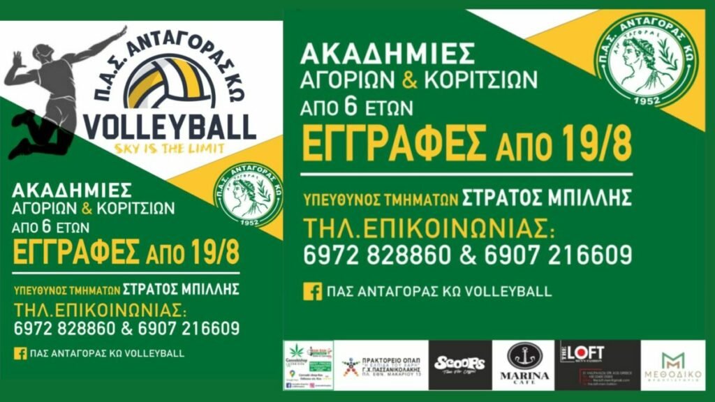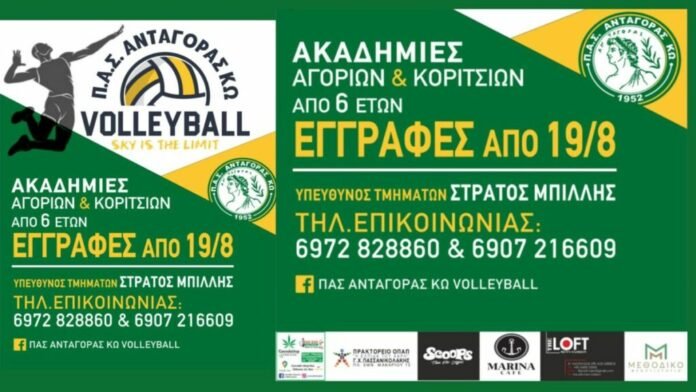 Ο Π.Α.Σ. Ανταγόρας Κω ανοίγει τις πόρτες του και καλεί όλα τα παιδιά – αγόρια και κορίτσια – να γνωρίσουν το άθλημα του βόλεϊ μέσα από τις ακαδημίες του συλλόγου. Οι εγγραφές ξεκίνησαν στις 19 Αυγούστου, για παιδιά από 6 ετών και άνω.