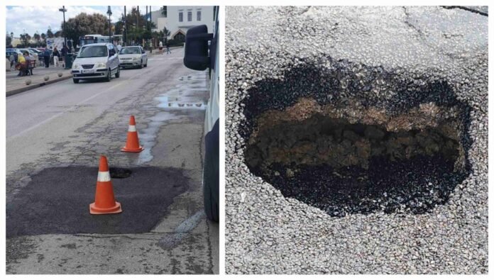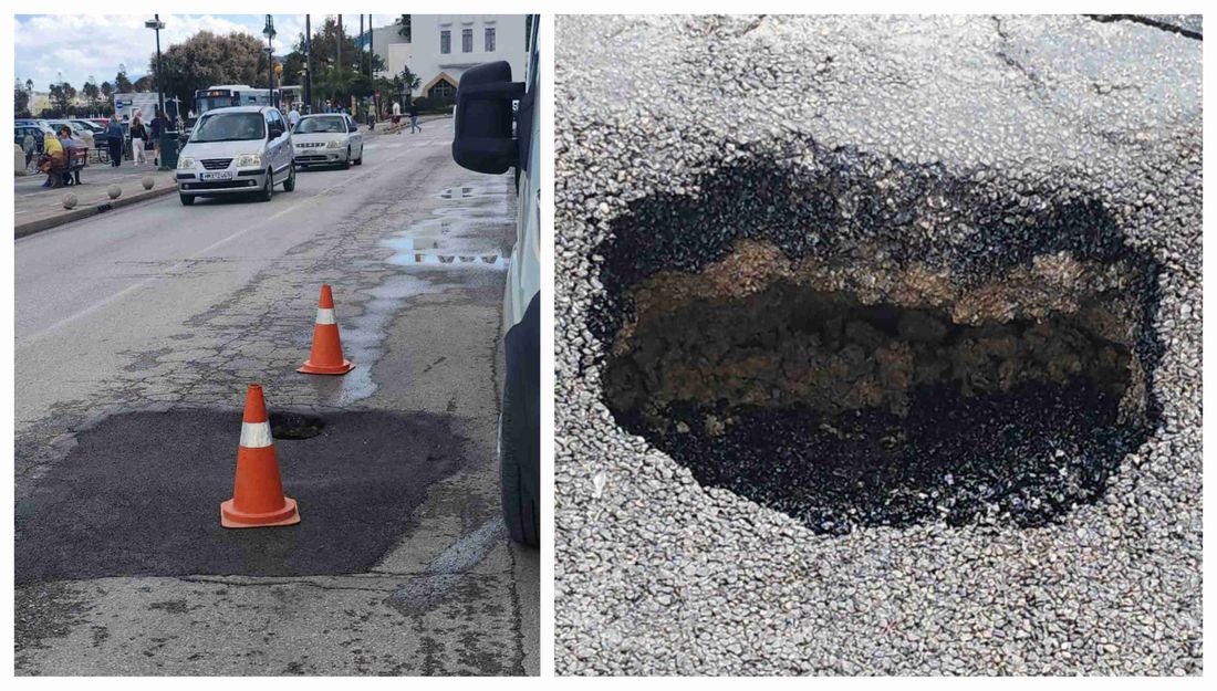 Τρύπα στο οδόστρωμα έξω από το Αστυνομικό Τμήμα Κω – Επιδεινώθηκε η κατάσταση μετά τις πρόσφατες εργασίες