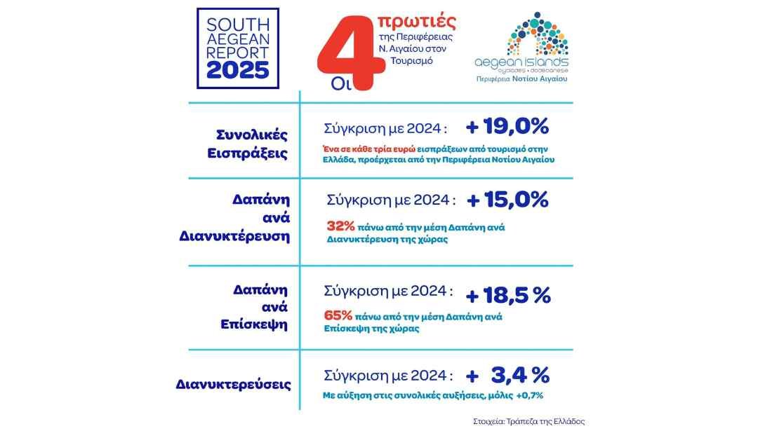 Οι συνολικές τουριστικές εισπράξεις αυξήθηκαν κατά 19% σε σχέση με τη αντίστοιχη περίοδο του 2024, ξεπερνώντας τα 6 δις ευρώ (€6.057,3). Ως αποτέλεσμα αυτού, το Νότιο Αιγαίο κατατάσσεται πρώτο μεταξύ των 13 περιφερειών της χώρας, συγκεντρώνοντας το 32% των συνολικών τουριστικών εισπράξεων της χώρας. Πολύ απλά, για κάθε 3 ευρώ εισπράξεων από τον τουρισμό στην Ελλάδα, ένα ευρώ προέρχεται από το Νότιο Αιγαίο.