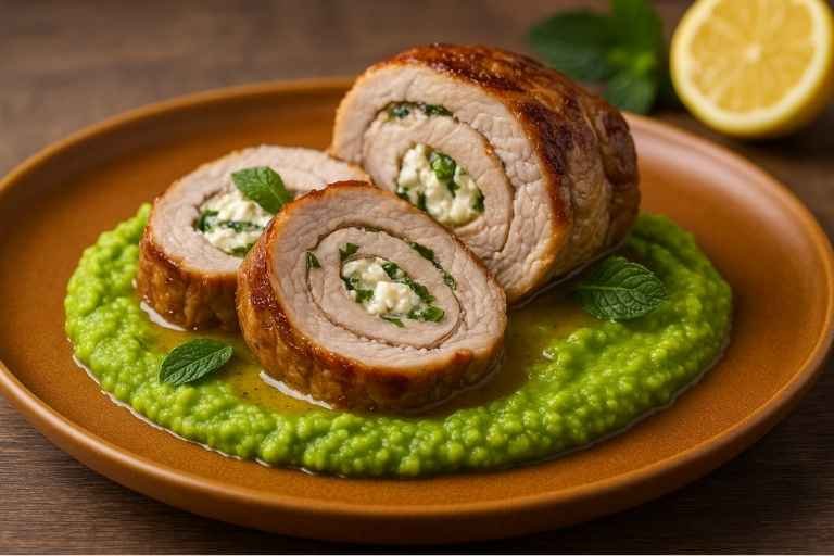 Χοιρινό ρολό με φέτα, δυόσμο και σάλτσα λεμονιού πάνω σε πουρέ αρακά