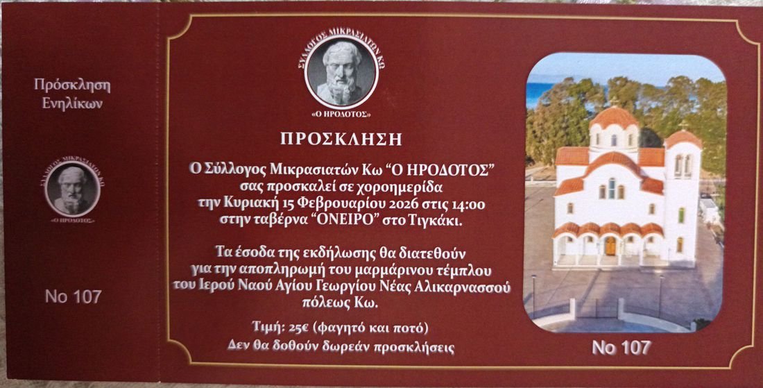 Ο Σύλλογος Μικρασιατών Κω «Ο Ηρόδοτος» διοργανώνει χοροημερίδα την Κυριακή 15 Φεβρουαρίου, στις 14:00, στην ταβέρνα «Όνειρο» στο Τιγκάκι.
