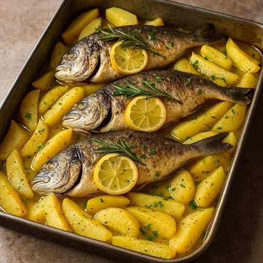 Ψάρι λεμονάτο με πατάτες στον φούρνο – Το άρωμα της θάλασσας στο πιάτο