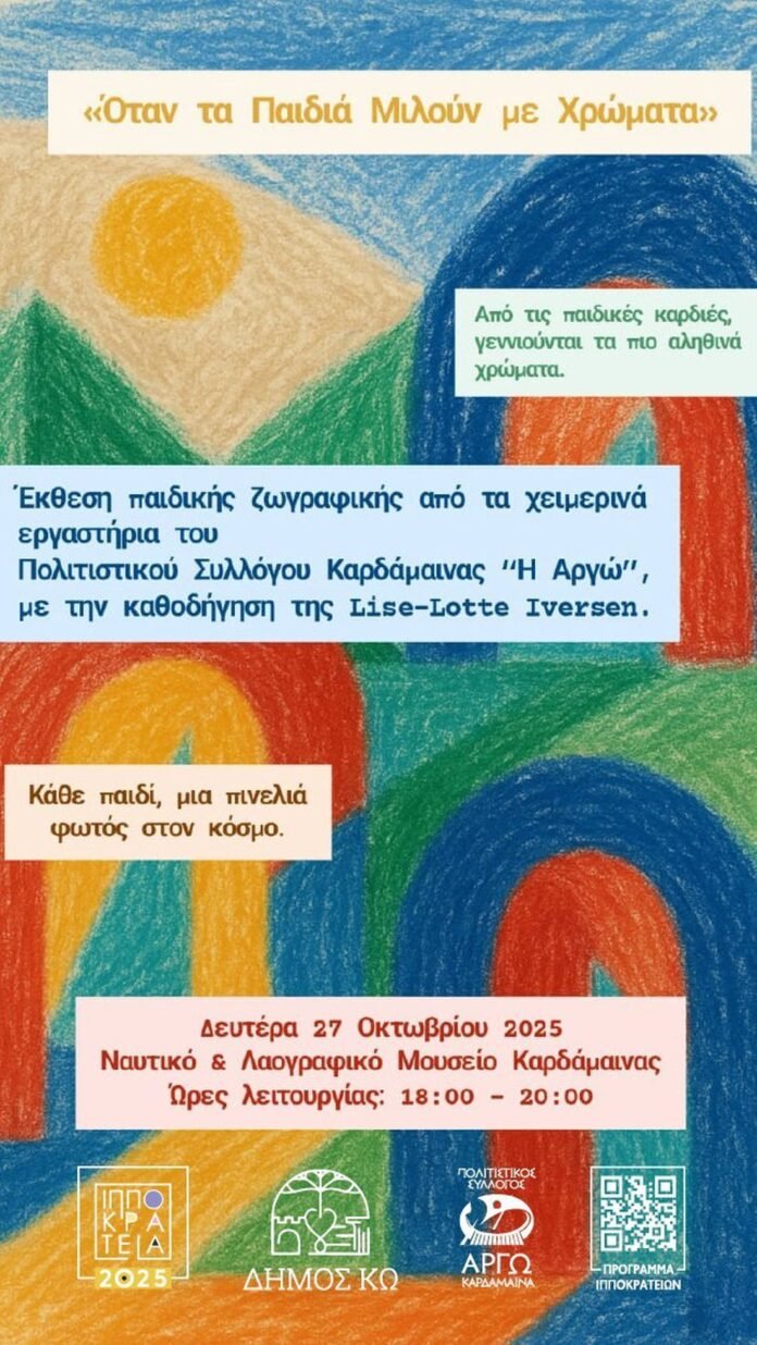 ΔΕΥΤΕΡΑ 27/10/25: «ΟΤΑΝ ΤΑ ΠΑΙΔΙΑ ΜΙΛΟΥΝ ΜΕ ΧΡΩΜΑΤΑ», σε συνεργασία με τον ΠΟΛΙΤΙΣΤΙΚΟ ΣΥΛΛΟΓΟ ΚΑΡΔΑΜΑΙΝΑΣ «ΑΡΓΩ»