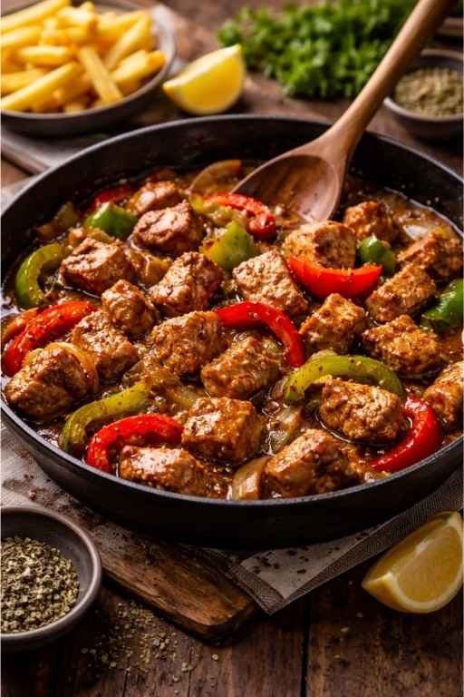 Σερβίρουμε ζεστή, με πατάτες τηγανητές ή ρύζι πιλάφι.