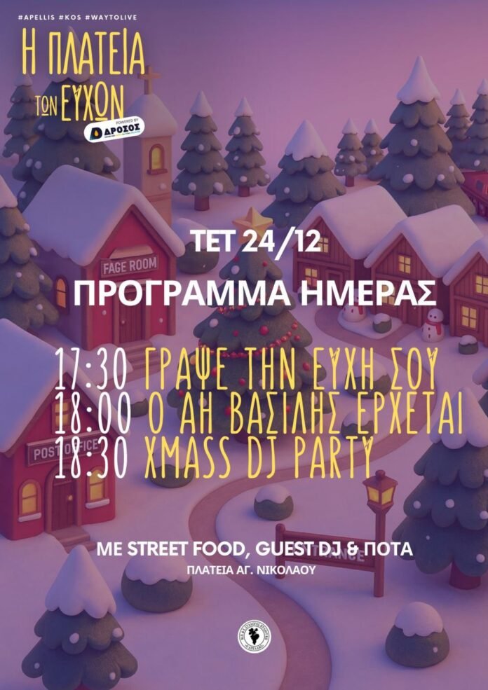 Το μικρό χριστουγεννιάτικο χωριό στο Πυλί, “Πλατεία των Ευχών” by Π. Δρόσος ΙΚΕ,  έχει ανοίξει τις πύλες του για πρώτη φορά στην Κω, σε έναν χώρο φτιαγμένο με μεράκι και πολύ φως. Στην πλατεία ο επισκέπτης μπορεί να βρει το σπίτι του Άη Βασίλη, το Σπιτάκι των Ευχών, όπου μπορεί να γράψει τις ευχές του για το νέο έτος, καθώς και το Δέντρο των Ευχών, στο οποίο οι επισκέπτες μπορούν να αφήσουν τις ευχές τους.