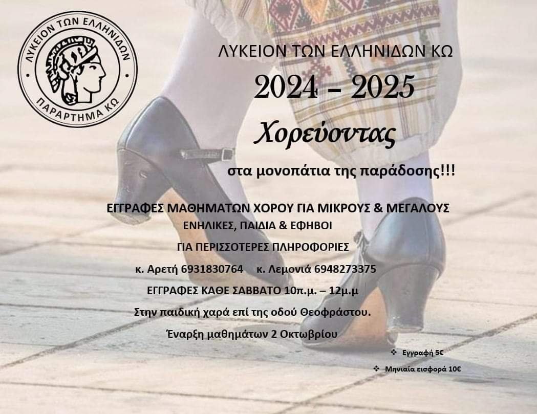 Με εμπειρία άνω των πενήντα ετών στον χώρο της εκμάθησης παραδοσιακών χορών και με συνεχή και πολυδιάστατη παρουσία στον ευρύτερο τομέα της ελληνικής παράδοσης, το Λύκειον των Ελληνίδων Κω προσφέρει μια ουσιαστική και ολοκληρωμένη επαφή με τον λαϊκό χορευτικό μας πολιτισμό.
