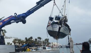 [Image showing a large crane lifting a wooden fishing boat out of the water at Mandraki harbor, with divers assisting at the surface]