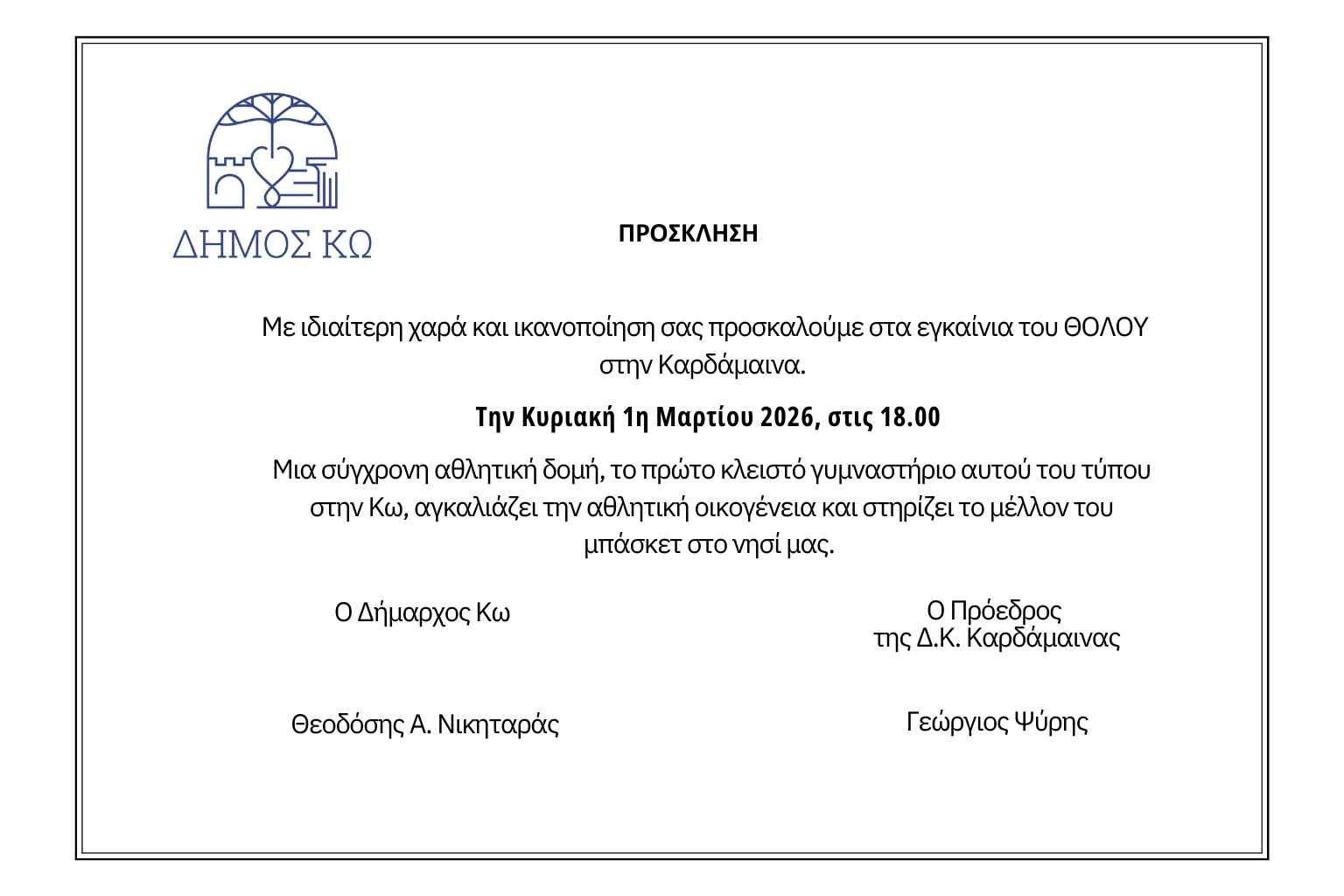 HomeΆλλαΑνακοινώσειςΕγκαίνια του Θόλου στην Καρδάμαινα – Το νέο κλειστό γυμναστήριο της Κω ΑνακοινώσειςΤοπική Επικαιρότητα Εγκαίνια του Θόλου στην Καρδάμαινα – Το νέο κλειστό γυμναστήριο της Κω By SkorpiosNews12 25/02/2026 0 33 Share FacebookTwitterPinterestWhatsApp TagsΑθλητισμόςΓεώργιος ΨύρηςΘεοδόσης ΝικηταράςΘόλος ΚαρδάμαιναςΚλειστό ΓυμναστήριοΚωςΜπάσκετ Share FacebookTwitterPinterestWhatsApp Previous articleΘΕΜΑ: «Η στήριξη και η ανάπτυξη των ορεινών περιοχών στη Βουλή με πρωτοβουλία του Μάνου Κόνσολα – Πρόταση του Βουλευτή Δωδεκανήσου για τη δημιουργία Ορεινού Ταμείου με εθνικούς και ευρωπαϊκούς πόρους» ΣΧΕΤΙΚΑ ΑΡΘΡΑ Τοπική Επικαιρότητα Έκθεση Μικρασιατικών Κειμηλίων στο Λαογραφικό Μουσείο «Το Χάνι» έως 28 Φεβρουαρίου 25/02/2026 Τοπική Επικαιρότητα Απεργιακή κινητοποίηση ξενοδοχοϋπαλλήλων και σερβιτόρων στην Κω έξω από τη ΔΥΠΑ 25/02/2026 Τοπική Επικαιρότητα Παρέμβαση Οδηγών Τουριστικών Λεωφορείων για τα προβλήματα του οδικού δικτύου στην Κω 25/02/2026 LEAVE A REPLY Cancel reply Comment: Please enter your comment! Name: Please enter your name here Email: You have entered an incorrect email address! Please enter your email address here Website: Save my name, email, and website in this browser for the next time I comment. - Advertisment - - Advertisment - - Advertisment - - Advertisment - - Advertisment - - Advertisment - ΤΑ ΠΙΟ ΔΙΑΒΑΣΜΕΝΑ ΘΕΜΑ: «Η στήριξη και η ανάπτυξη των ορεινών περιοχών στη Βουλή με πρωτοβουλία του Μάνου Κόνσολα – Πρόταση του Βουλευτή Δωδεκανήσου για τη δημιουργία... 25/02/2026 Με οκτώ αθλητές ο Π.Α.Σ. Ανταγόρας στην Α’ φάση του Πανελλήνιου Πρωταθλήματος Άρσης Βαρών 25/02/2026 Έκθεση Μικρασιατικών Κειμηλίων στο Λαογραφικό Μουσείο «Το Χάνι» έως 28 Φεβρουαρίου 25/02/2026 Απεργιακή κινητοποίηση ξενοδοχοϋπαλλήλων και σερβιτόρων στην Κω έξω από τη ΔΥΠΑ 25/02/2026 ΠΡΟΣΦΑΤΑ ΣΧΟΛΙΑ on Νέο κατάστημα LC Waikiki ανοίγει στη Ρόδο – Ξεκίνησαν οι διαδικασίες στελέχωσης Leonidas on Η συνταγή της ημέρας από τον σεφ Ηλία Μονογυιό – Παραδοσιακό παστίτσιο με κρέμα μπεσαμέλ