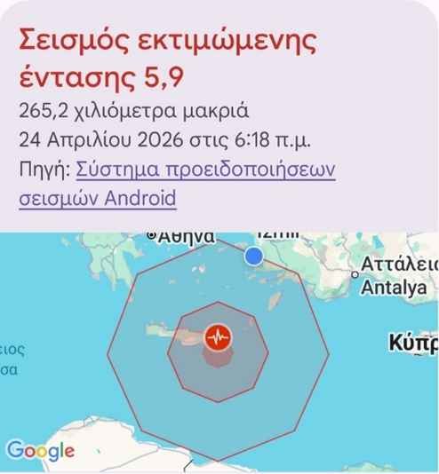 Ανησυχία προκάλεσε η ισχυρή σεισμική δόνηση που σημειώθηκε νωρίς το πρωί της 24ης Απριλίου 2026, στις 06:18. Σύμφωνα με τις πρώτες εκτιμήσεις από το Σύστημα Προειδοποιήσεων της Android και το Γεωδυναμικό Ινστιτούτο, ο σεισμός είχε μέγεθος μεταξύ 5,5 και 5,9 βαθμών της κλίμακας Ρίχτερ.