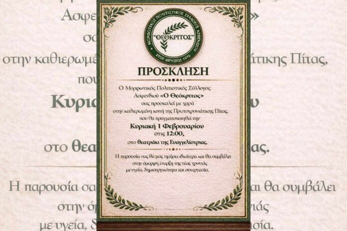 Ο Μορφωτικός Πολιτιστικός Σύλλογος Ασφενδιού «Ο Θεόκριτος» σας προσκαλεί στην κοπή της Πρωτοχρονιάτικης πίτας που θα πραγματοποιηθεί την Κυριακή 1 Φεβρουαρίου 2026, στις 12:00, στο Θεατράκι της Ευαγγελίστριας.