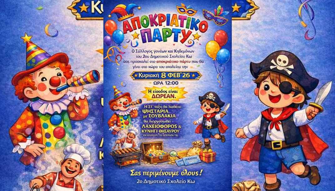Ο Σύλλογος Γονέων και Κηδεμόνων του 2ου Δημοτικού Σχολείου Κω διοργανώνει ένα αποκριάτικο πάρτι για μικρούς και μεγάλους. Η εκδήλωση θα λάβει χώρα στον χώρο του σχολείου την Κυριακή 8 Φεβρουαρίου, με ώρα έναρξης στις 12:00 το μεσημέρι. Η είσοδος για το κοινό είναι δωρεάν.