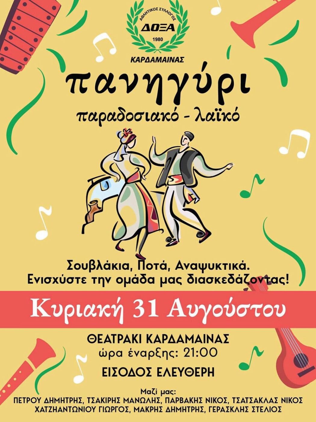 Με μια μεγάλη παραδοσιακή γιορτή, ο Αθλητικός Σύλλογος «ΔΟΞΑ» Καρδάμαινας προσκαλεί τους κατοίκους και τους επισκέπτες του νησιού στο καθιερωμένο του πανηγύρι, την Κυριακή 31 Αυγούστου, στο Θεατράκι Καρδάμαινας, με ώρα έναρξης τις 21:00.