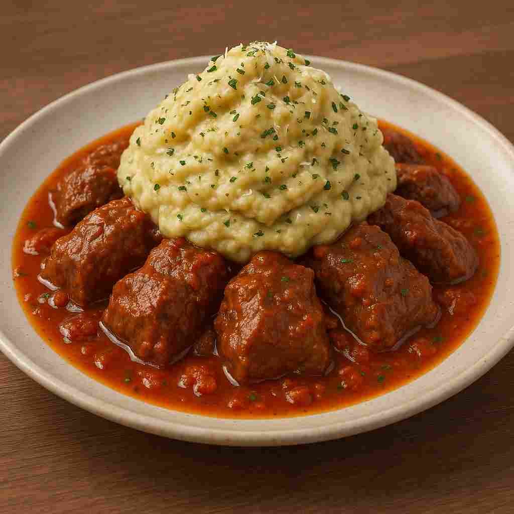 Ένα πιάτο με ρίζες βαθιά στην ελληνική παράδοση. Το μοσχαράκι μαγειρεύεται αργά με κόκκινη σάλτσα και μπαχαρικά, ενώ από πάνω στρώνεται ένας βελούδινος πουρές καπνιστής μελιτζάνας που θυμίζει μπεσαμέλ, δίνοντάς του πλούσια γεύση και υπέροχο άρωμα. Ένα φαγητό που θυμίζει παλιά ελληνικά τραπέζια και ταιριάζει ιδανικά με μια φέτα ψωμί για βούτες.