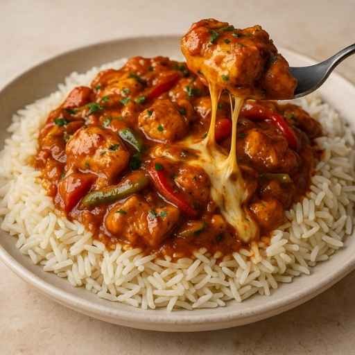 Ο σεφ Ηλίας Μονογυιός φέρνει στο τραπέζι έναν μπεκρή μεζέ που ξεχειλίζει από αρώματα και γεύσεις. Κοτόπουλο σε πικάντικη σάλτσα με κρασί και πιπεριές, σερβιρισμένο πάνω σε αφράτο ρύζι μπασμάτι που μαγειρεύεται με κύβους κοτόπουλου και βούτυρο για μέγιστη νοστιμιά. Ένα πιάτο με μερακλίδικο χαρακτήρα που «δένει» στο τέλος με λιωμένα τυριά, για αποτέλεσμα που λιώνει στο στόμα.