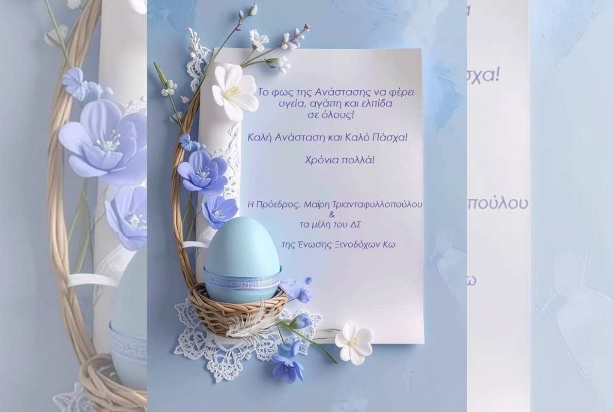 Με ένα μήνυμα γεμάτο φως και αισιοδοξία, η Ένωση Ξενοδόχων Κω απευθύνεται στους κατοίκους, τους επαγγελματίες του τουρισμού και τους επισκέπτες του νησιού μας, στέλνοντας τις θερμότερες ευχές της για τις άγιες ημέρες του Πάσχα.