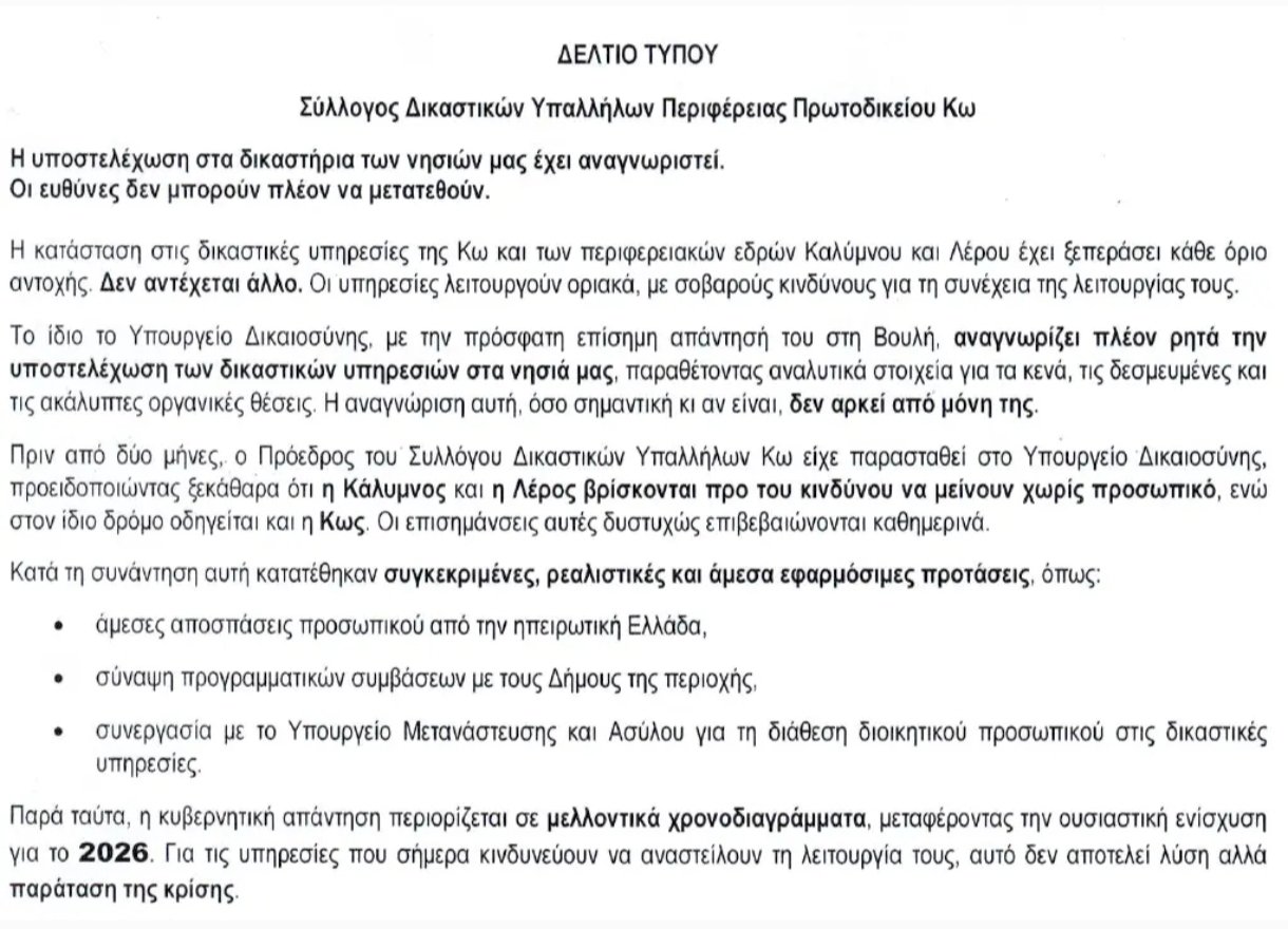 ΑρχικήΤοπική ΕπικαιρότηταΣοβαρή προειδοποίηση για τα δικαστήρια Κω, Καλύμνου και Λέρου – Στο όριο... Τοπική Επικαιρότητα Σοβαρή προειδοποίηση για τα δικαστήρια Κω, Καλύμνου και Λέρου – Στο όριο η λειτουργία λόγω υποστελέχωσης By SkorpiosNews12 19 Δεκεμβρίου 2025 341 μερίδιο FacebookXPinterestWhatsApp ΠΗΓΗvimatisko.gr Tagsδελτίο τύπουδικαιοσύνηδικαστικοί υπάλληλοιΚάλυμνοςΚωςΛέροςΠρωτοδικείο Κωυποστελέχωση δικαστηρίωνΥπουργείο Δικαιοσύνης μερίδιο FacebookXPinterestWhatsApp Προηγούμενο άρθροΣτην Πορταριά τα Τουρνουά Χριστουγέννων Αγοριών «Π. Καπαγέρωφ» – Παρών και ο Διονύσης Γιαμούζης του Φοίβου ΚωΕπόμενο άρθροΧριστουγεννιάτικο παραμύθι από τη Θεατρική Ομάδα του «Απελλή» στο Πυλί ΣΧΕΤΙΚΑ ΑΡΘΡΑ Τοπική Επικαιρότητα Ζηπάρι Κω: Στην Τελική Ευθεία η Ασφαλτόστρωση του Κεντρικού Δρόμου 21 Μαρτίου 2026 Ανακοινώσεις Β΄ ΕΛΜΕ Δωδεκανήσου: Συμμετοχή σε Πανελλαδική Σύσκεψη και Αντιπολεμικό Συλλαλητήριο στην Κω 21 Μαρτίου 2026 Τοπική Επικαιρότητα Άδωνις Γεωργιάδης: Λύση για τα Μικροβιολογικά στην Κω έως το τέλος Απριλίου 21 Μαρτίου 2026 ΑΦΗΣΤΕ ΜΙΑ ΑΠΑΝΤΗΣΗ Ακύρωση απάντησης Σχόλιο: εισάγετε το σχόλιό σας! Όνομα: παρακαλώ εισάγετε το όνομά σας εδώ Email: έχετε εισάγει εσφαλμένη διεύθυνση ηλεκτρονικού ταχυδρομείου! παρακαλώ εισάγετε εδώ την ηλεκτρονική σας διεύθυνση Ιστοσελίδα: αποθηκεύστε το όνομα, το ηλεκτρονικό ταχυδρομείο και τον ιστότοπό μου σε αυτό το πρόγραμμα περιήγησης για την επόμενη φορά που θα σχολιάσω. ΤΑ ΠΙΟ ΔΙΑΒΑΣΜΕΝΑ Κριθαράκι με χταπόδι λεμονάτο 22 Μαρτίου 2026 Ιρανικοί πύραυλοι φτάνουν σε νέες αποστάσεις – Προβληματισμός για την ασφάλεια της Ελλάδας 22 Μαρτίου 2026 Ο καιρός στην Κω: Ήλιος και ηρεμία μέχρι Δευτέρα – μικρή αλλαγή μέσα στην εβδομάδα 21 Μαρτίου 2026 Ζηπάρι Κω: Στην Τελική Ευθεία η Ασφαλτόστρωση του Κεντρικού Δρόμου 21 Μαρτίου 2026 ΠΡΟΣΦΑΤΑ ΣΧΟΛΙΑ επί Νέο κατάστημα LC Waikiki ανοίγει στη Ρόδο – Ξεκίνησαν οι διαδικασίες στελέχωσης Leonidas επί Η συνταγή της ημέρας από τον σεφ Ηλία Μονογυιό – Παραδοσιακό παστίτσιο με κρέμα μπεσαμέλ