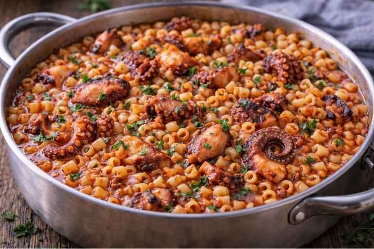 Το χταπόδι δεν χρειάζεται πολύ νερό γιατί βγάζει τα δικά του υγρά. Η χαμηλή φωτιά το κρατά τρυφερό. Το κοφτό μακαρονάκι πρέπει να μείνει ζουμερό και δεμένο με τη σάλτσα. Αν θέλεις πιο έντονη γεύση, βάλε λίγο μπαχάρι ή λίγη κανέλα.