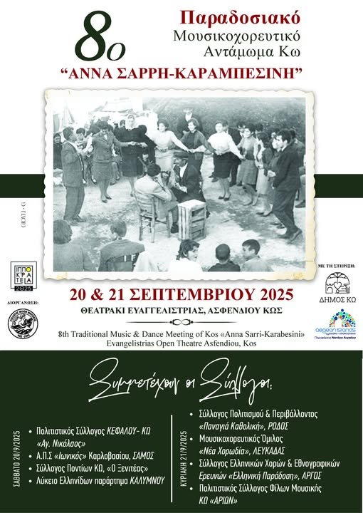Η Κως υποδέχεται για όγδοη συνεχή χρονιά το Παραδοσιακό Μουσικοχορευτικό Αντάμωμα «Άννα Σαρρή-Καραμπεσίνη», μια εκδήλωση που αποτελεί πλέον θεσμό για το νησί. Το φεστιβάλ θα πραγματοποιηθεί το Σάββατο 20 και την Κυριακή 21 Σεπτεμβρίου 2025, στο Θεατράκι της Ευαγγελίστριας στο Ασφενδιού, με ώρα έναρξης τις 20:00.