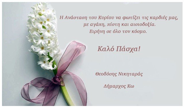 Η πασχαλινή κάρτα του Δημάρχου, διακοσμημένη με ένα λευκό υάκινθο, σύμβολο αγνότητας και άνοιξης, αντανακλά το κλίμα κατάνυξης και αισιοδοξίας που επικρατεί στο νησί της Κω κατά τη διάρκεια της Μεγάλης Εβδομάδας.